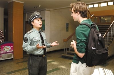 前日,北京大学一名保安在课余时间和外国留学生交流。